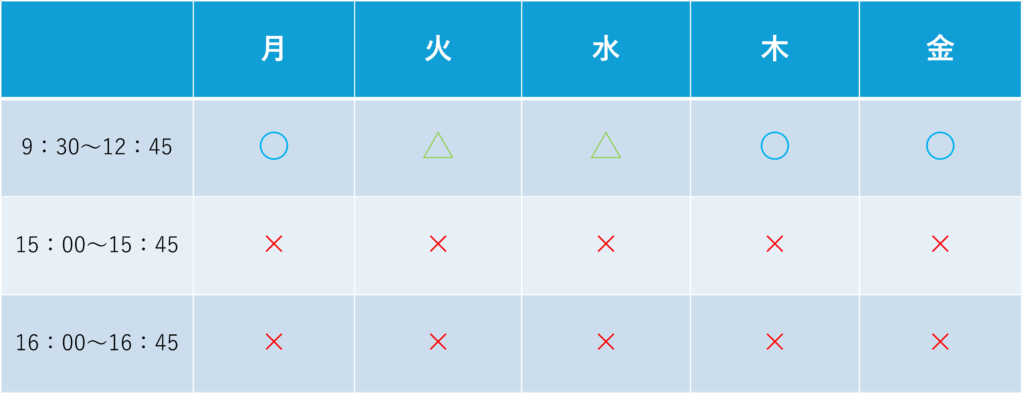 ×=空きなし △=わずかに空きあり 〇=十分に空きあり