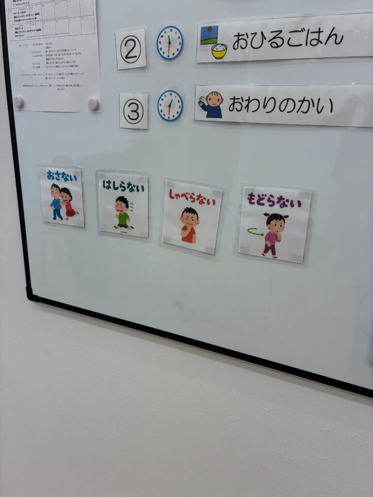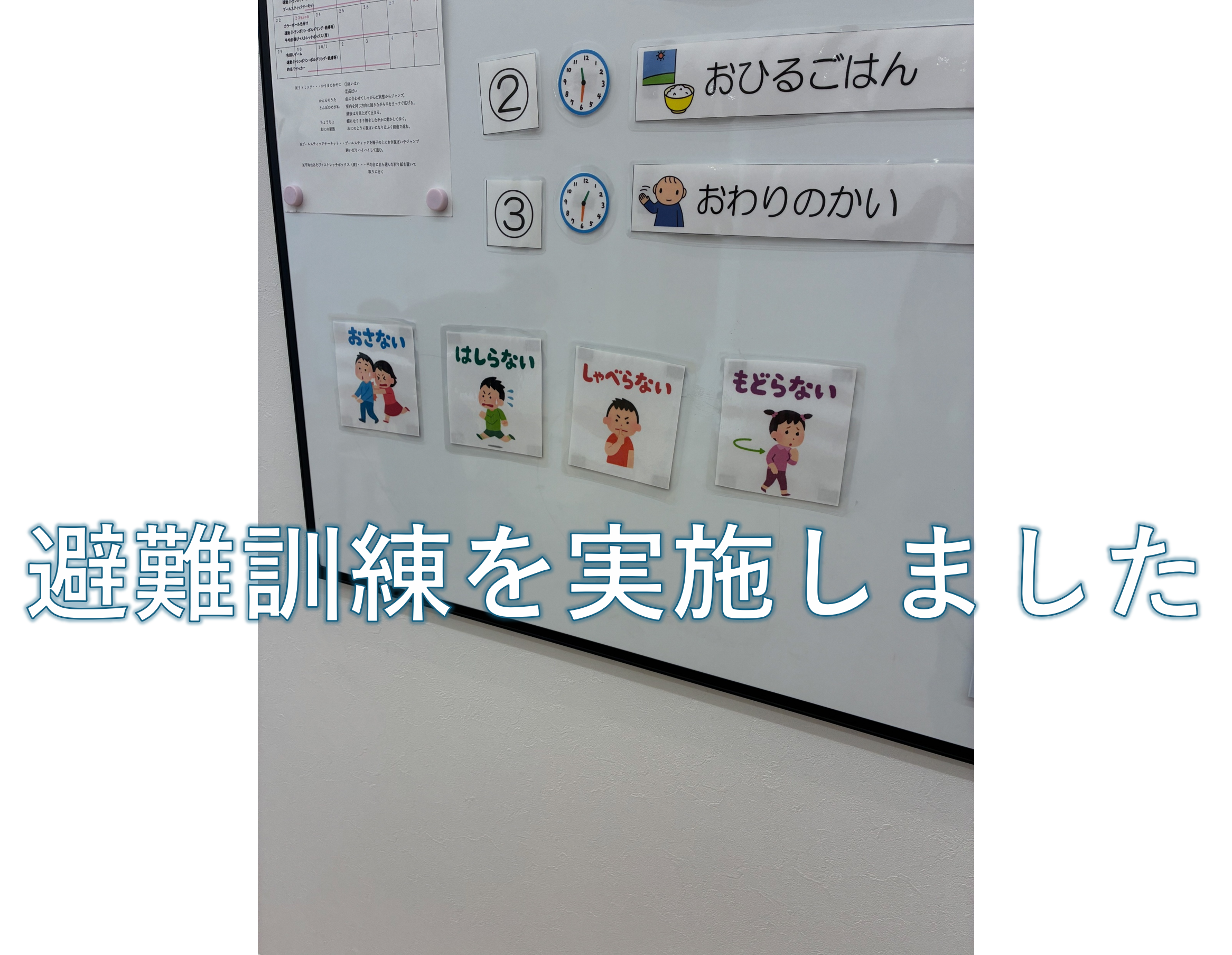 先日、避難訓練を実施しました。視覚的支援を用いて、こどもたちにわかりやすく実施できるよう心掛けております。