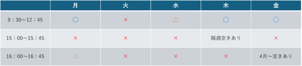 〇=空きあり △=わずかに空きあり ×=空きなし