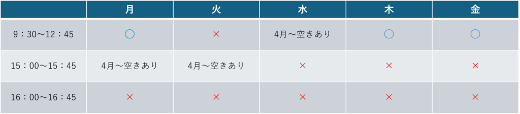 〇=空きあり △=わずかに空きあり ×=空きなし