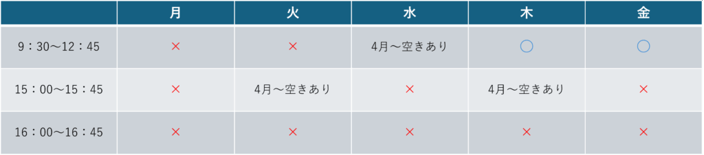 〇=空きあり △=わずかに空きあり ×=空きなし